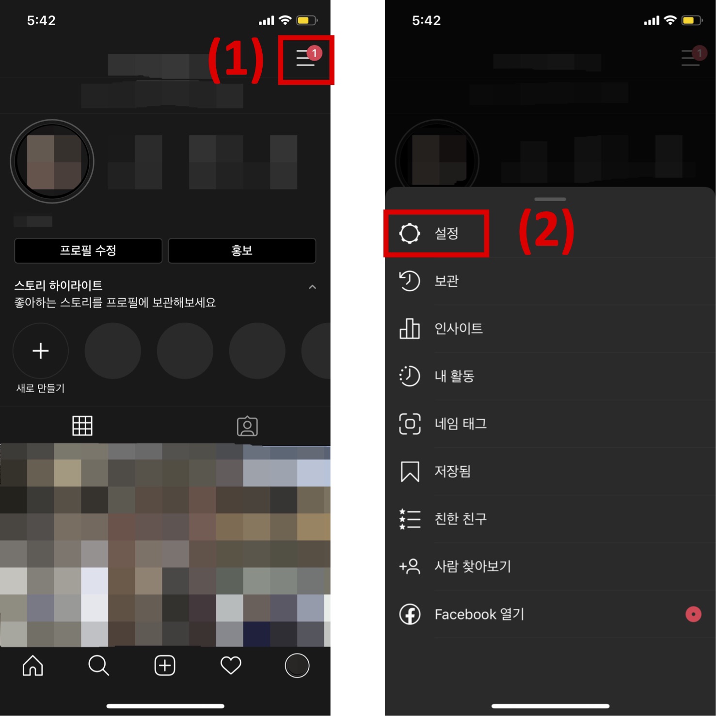- 프로필 화면 우측 상단의 햄버거바(선 세 개 모양의 버튼)를 클릭합니다.