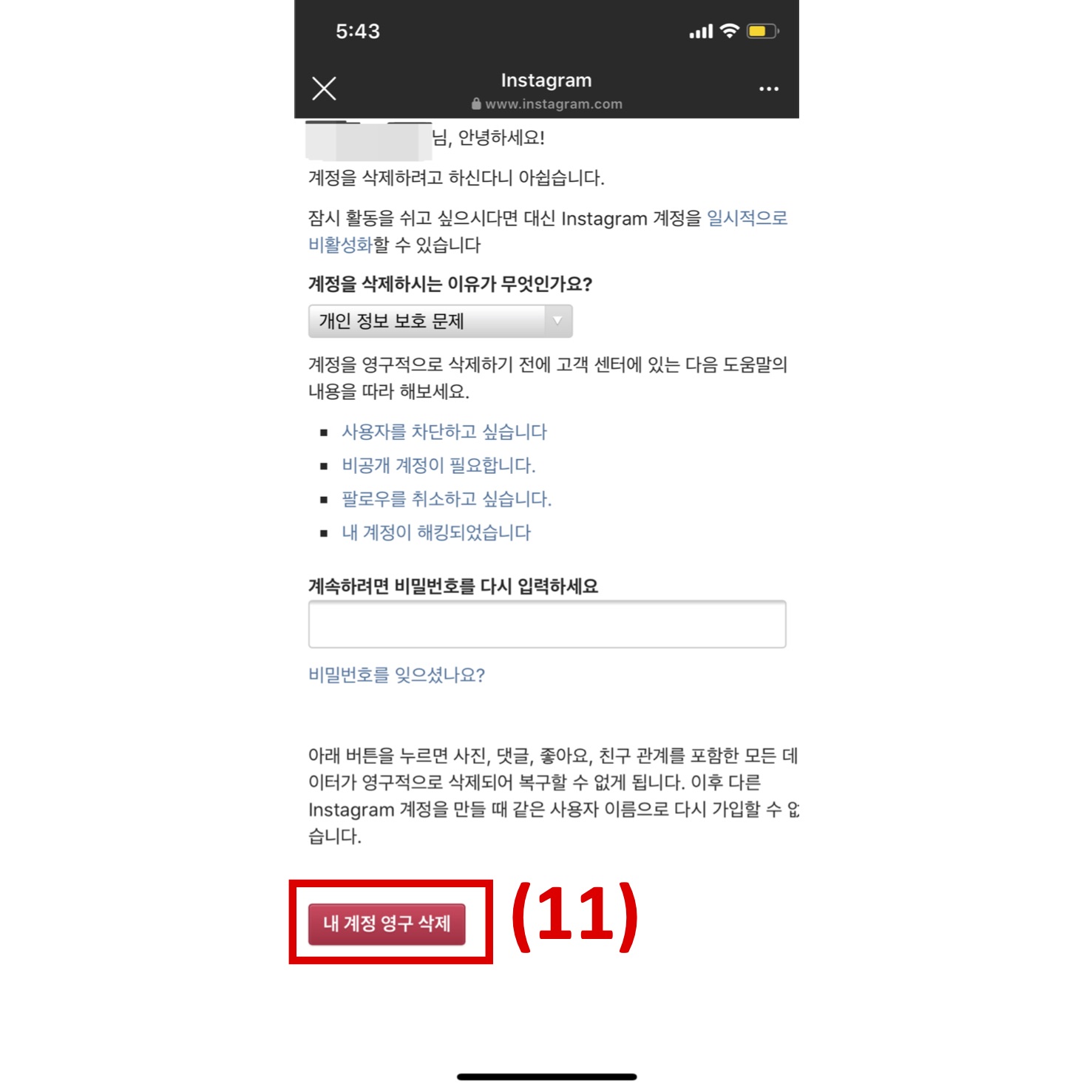 11. 드디어 끝입니다. 빨간색으로 된 '내 계정 영구 삭제' 버튼을 클릭하시면 여러분은 인스타그램 삭제에 성공하신 것입니다. 축하드립니다!